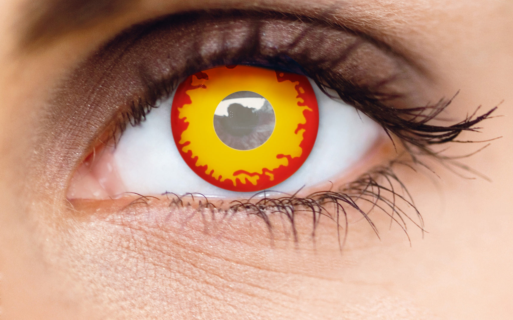 - Fiery and mesmerizing. The Fire Me contact lens is designed to transport you into the heart of a blazing inferno. Featuring a vivid fire-red iris with a striking yellow flame-like pattern, these lenses create an intense and mesmerizing look that's perfect for Halloween.