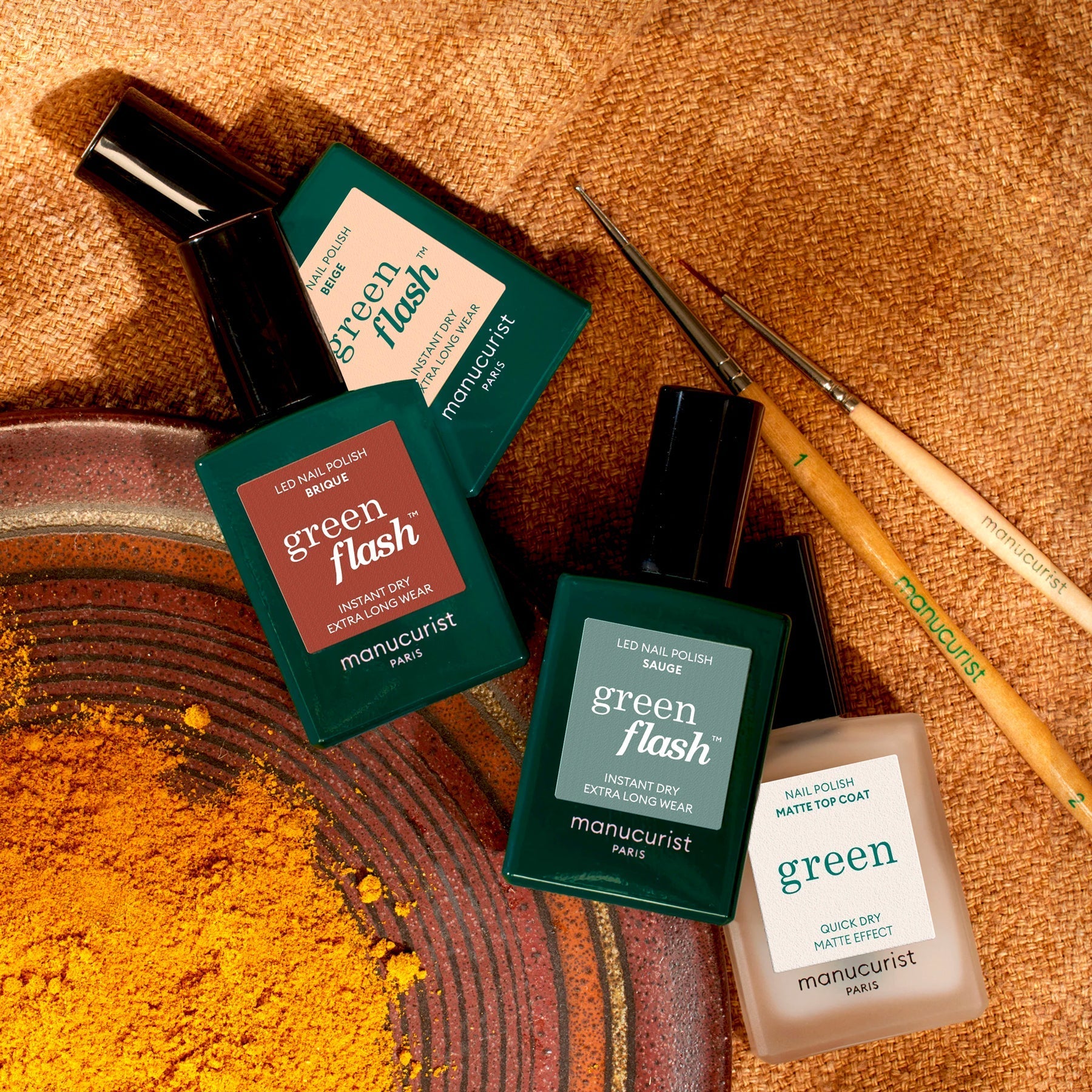 This set contains all the products needed to create the?Geometry Obsession?nail art look from our?Autumn 2023 collection: 3 colors in Green Flash? or Green (Beige,Sauge, Brick) + 1 Nail Art Liner Brush, 1 Dotting Tool and 1 Matte Top Coat.