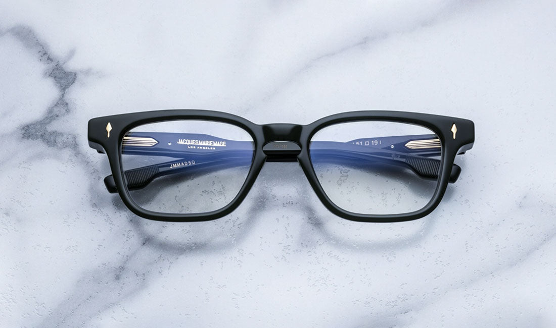 Reflect upon the absurdity of existence in these elegant, lightweight Jacques Marie Mage Artaud spectacles that feature JMM’s signature floating hinge system. The Artaud is named after influential French author Antonin Artaud, one of the major figures of twentieth-century theatre and the European avant-garde. The Jacques Marie Mage Artaud is an elegant and soft rectangular shape with a keyhole nose and cut-out volume details made of 12mm block acetate with custom double-laminated acetate temples and features precious metal hardware.
